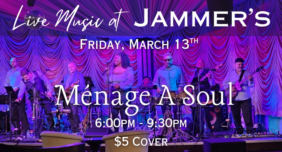Menage A Soul is back at Jammer's for another Friday the 13th bash! Time to get out on the dance floor for this high energy band playing the best retro soul, disco, pop and classic rock!