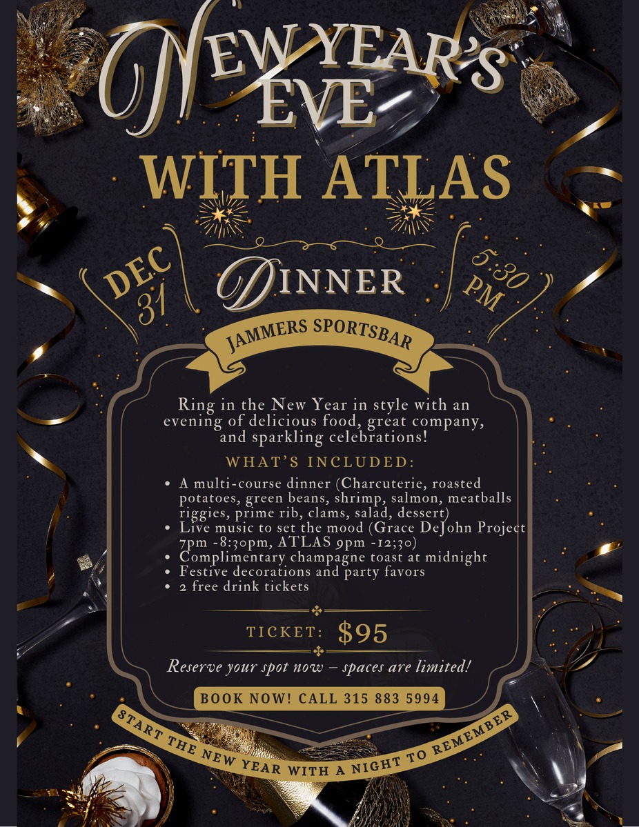 Celebrate the New Year at Jammer's with live music, food, drink tickets, and a champagne toast at midnight. Call to make your reservation today!!